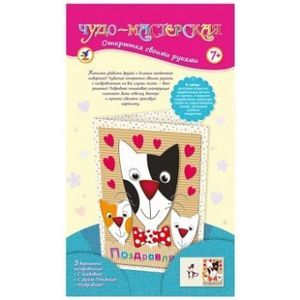 В наборе: заготовка открытки, вырубленные детали из картона, 3 варианта поздравления, самоклеящиеся стразы, объемные клейкие квадратики.