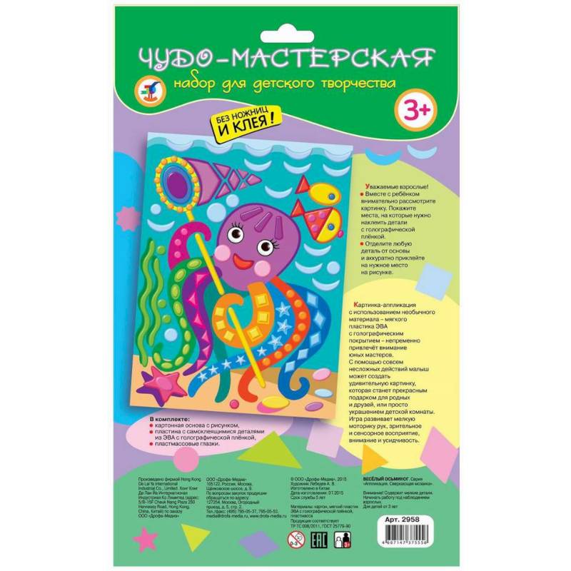 В комплекте: картонная основа с рисунком, пластина с самоклеящимися деталями из ЭВА с голографической плёнкой, пластмассовые глазки.