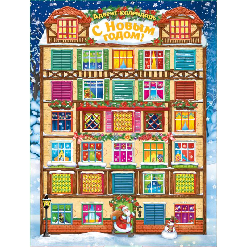 Уникальный подарочный набор для веселого и запоминающегося ожидания Нового года. На красочной коробке из плотного картона помещено 31 окошко. Ежедневно, начиная с 1 декабря, малыш открывает одну створку и дарит гостинец-наклейку зверьку, который живет в окошке. В коробку вложен большой плакат 48х64 см, лист наклеек 42,5х62 см, предновогодние задания и заготовки для поделок к празднику.