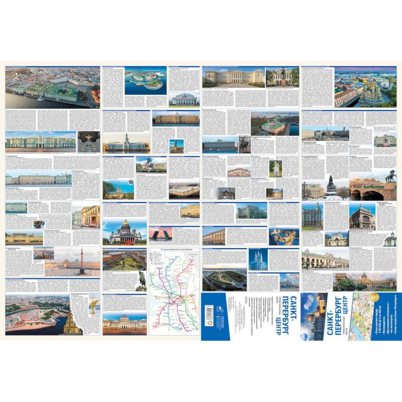 На одной стороне листа - карта Санкт-Петербурга, на другой стороне - краткий путеводитель с описанием основных музеев, театров, выставочных и концертных залов города. На карте наглядно представлена центральная, наиболее интересная в историческом, архитектурном и культурном смысле, часть Санкт-Петербурга. Цветом выделены основные транспортные магистрали города, некоторые интересные туристические объекты, выражаемые в масштабе карты, вокзалы, парки, водные объекты. Театры, музеи и пр. показаны внемасштабными знаками. Некоторые известные здания и сооружения даны рисунками. Карта снабжена подробным указателем улиц и мостов, а также музеев, театров и других учреждений культуры. Основная карта дополнена схемой скоростного транспорта.
