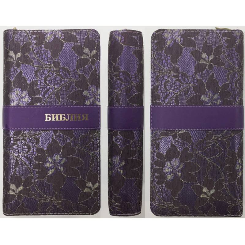формат83х175 мм, переплет с тонкой вышивкой, молния,'золотой' обрез с голографическим напылением, закладка, индексы дляпоиска библейских книг.