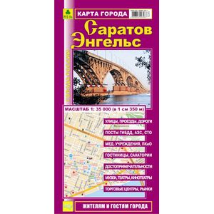 Двусторонняя полноцветная карта. Содержит подробный план города со всеми улицами, номерами угловых домов. Указано расположение административных зданий и социально-культурных объектов. Имеется указатель улиц. Масштабы городов Саратов и Энгельс 1:35000. Указано расположение постов ГИБДД, автозаправочных станций, гостиниц.