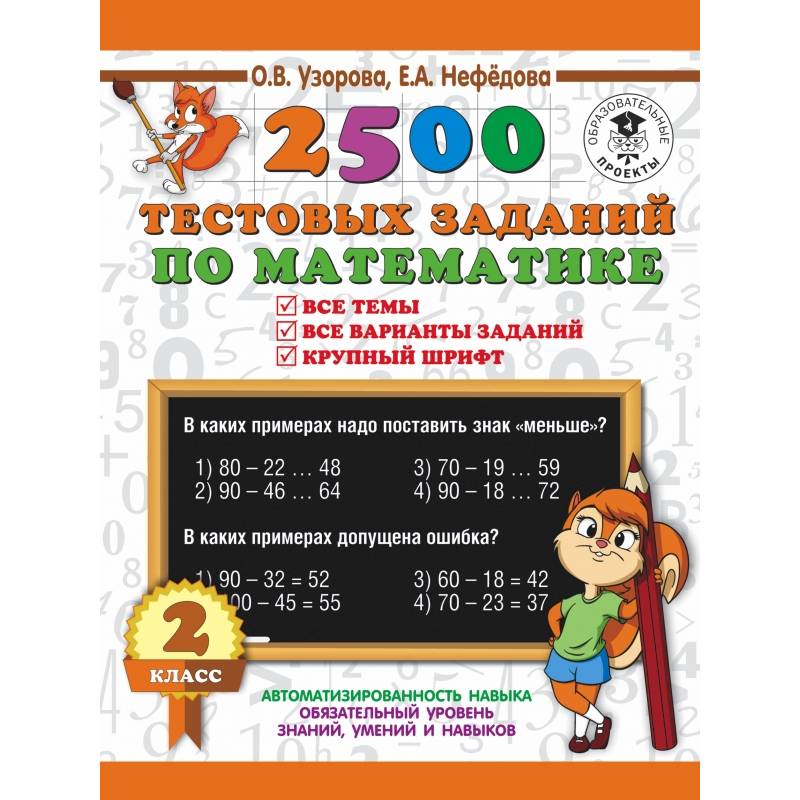 Пособие содержит тестовые задания по всем основным темам курса математики для 2 класса. Впервые для каждой изученной темы предложены тесты, позволяющие проверить, как её ученик её усвоил. При помощи тестов осуществляется закрепление и проверка полученных знаний, чётко выявляются 'слабые места'. Данные тесты с первого класса готовят ребёнка к последующим тестовым испытаниям, в том числе к ГИА и ЕГЭ.